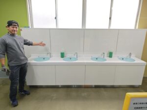 手洗い場では、従来の蛇口ではなくセンサー式の水栓を導入。